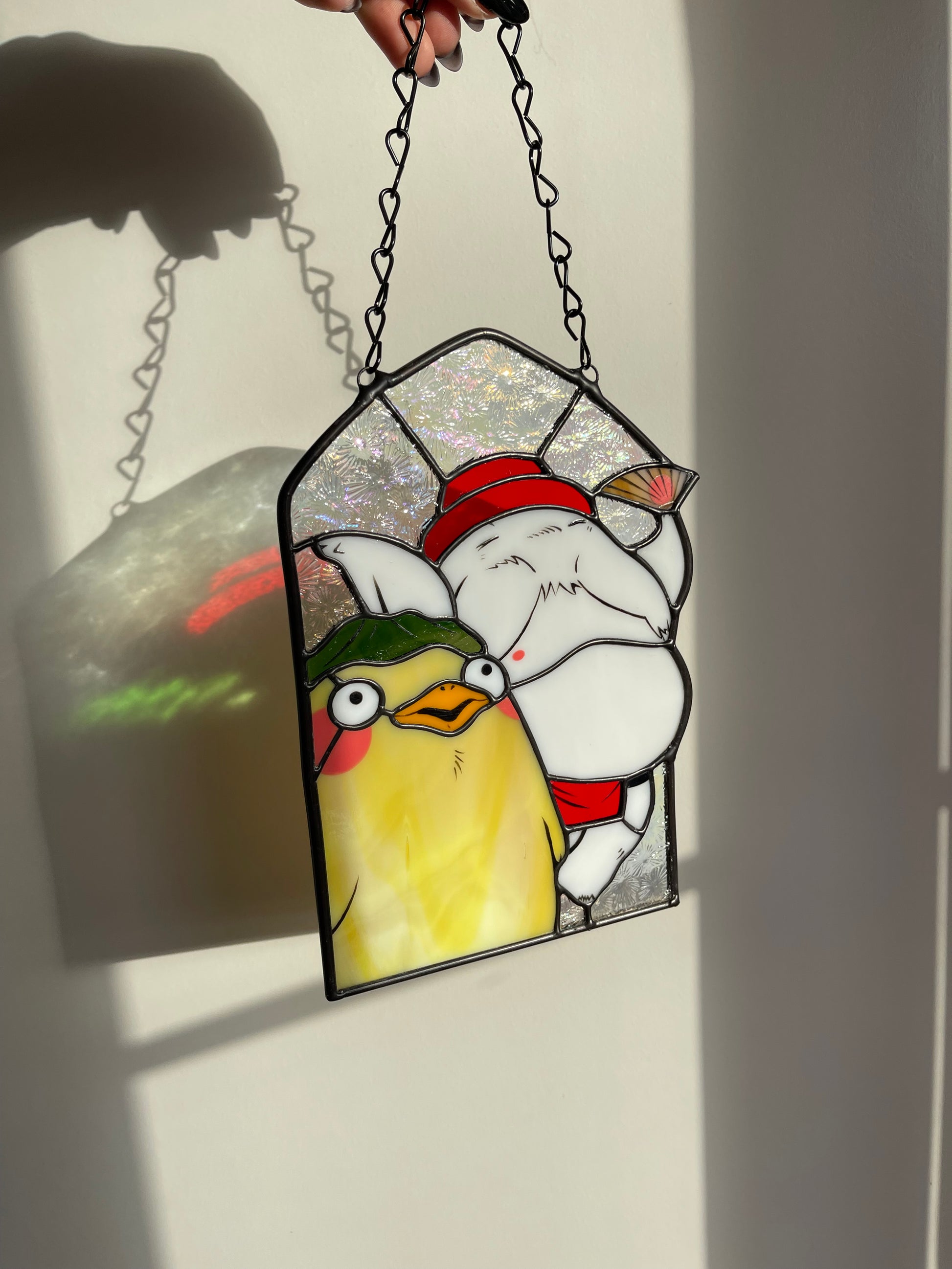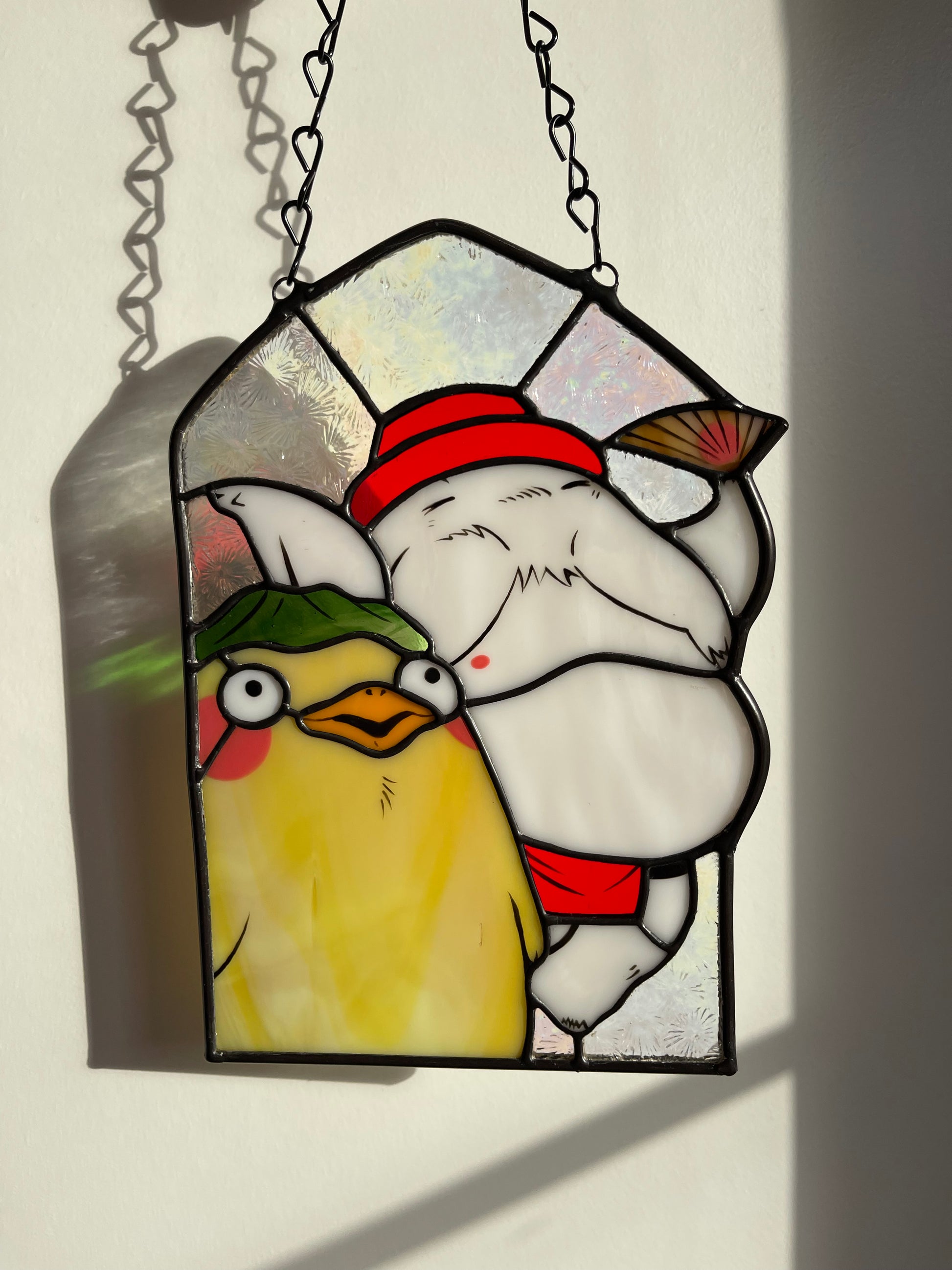 For Ōtori-Sama, I used streaky opaque yellow glass, paired with opaque orange for the beak and a transparent, wispy green for the little leaf hat. Oshira-Sama is crafted from a mix of transparent red and opaque white glass. Everything is tied together with a clear iridescent glass frame and finished with hand-painted details.